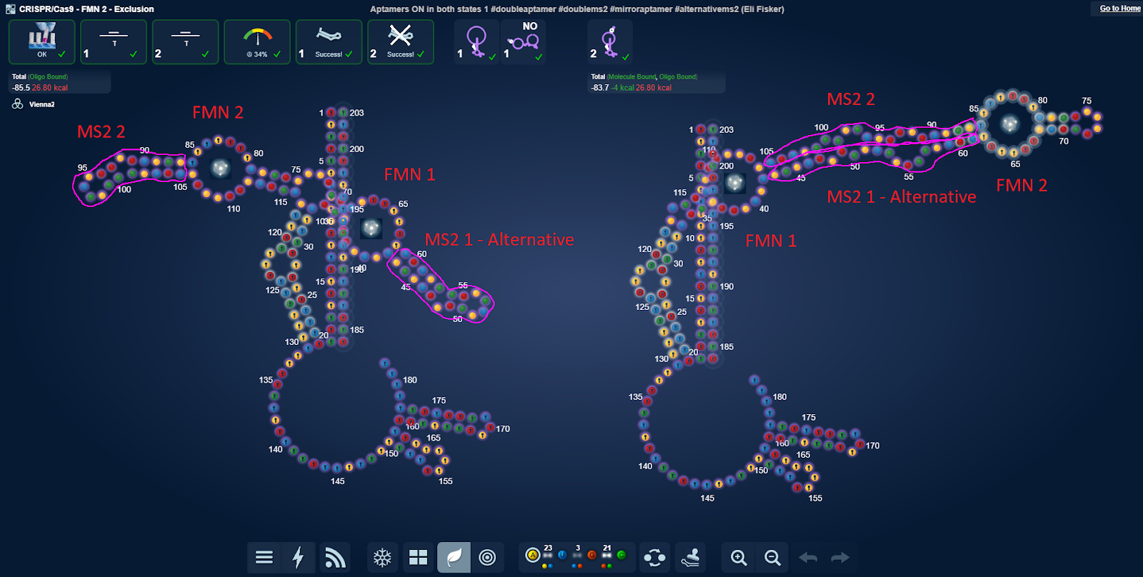 It could also be interesting having frequency experiments where the static stem gradually gets moved between being next to the aptamer gate to being next to the MS2. In a systematic manner. Like the ones Omei has done and I show in this intro to using eterna spreadsheets.