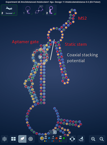 So I decided to take one of my experiment designs, and split the static stem in two static stems and move the one part so both of them would be doing coaxial to a stem in the ON state. One at the aptamer gate and one next to the MS2.