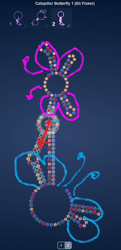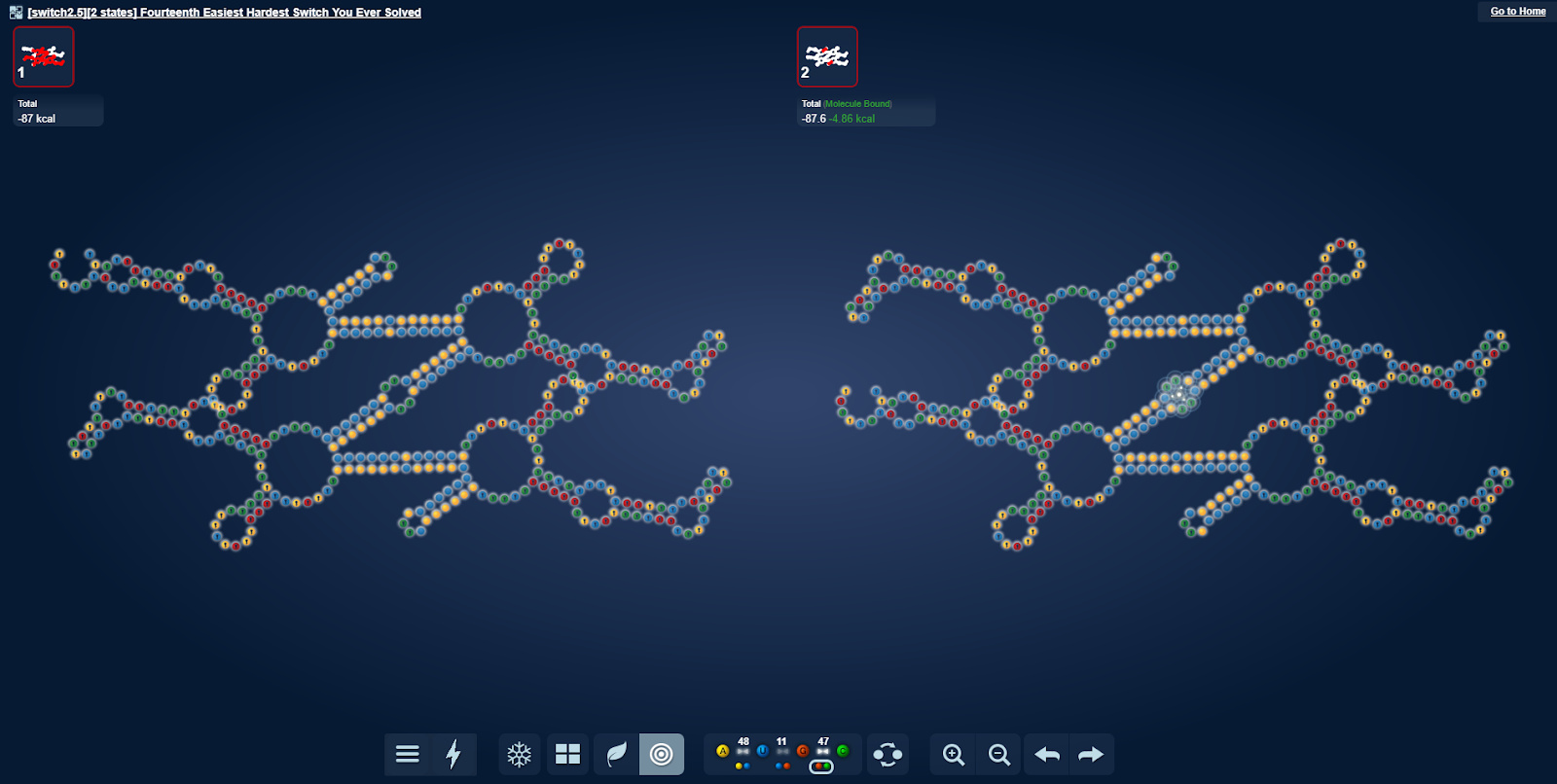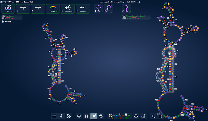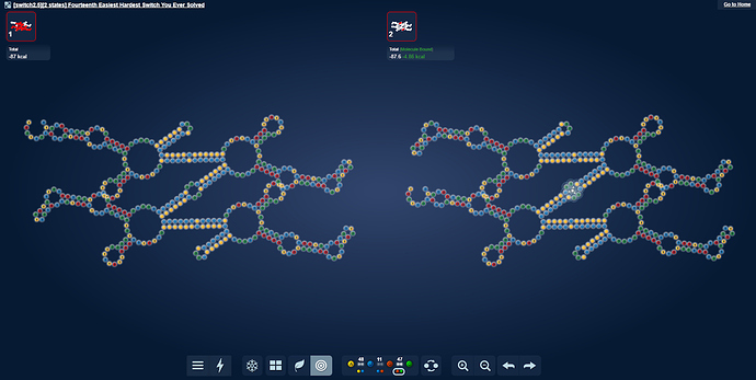 While the puzzle switch, there isn’t much structure change. There are only 14 switching stems in the main middle part of the puzzle and not the 16 I would have expected. This is due to the motifs sharing coaxial stackings.
