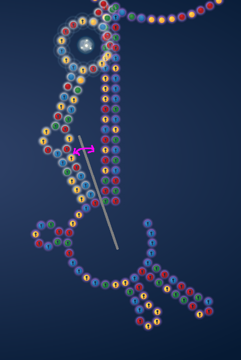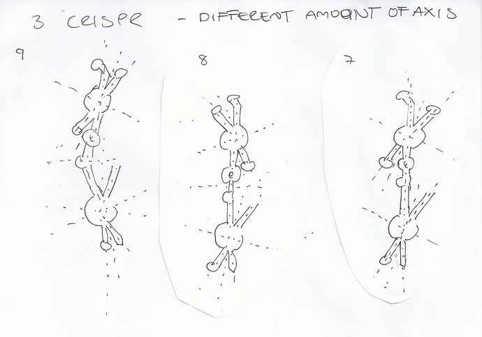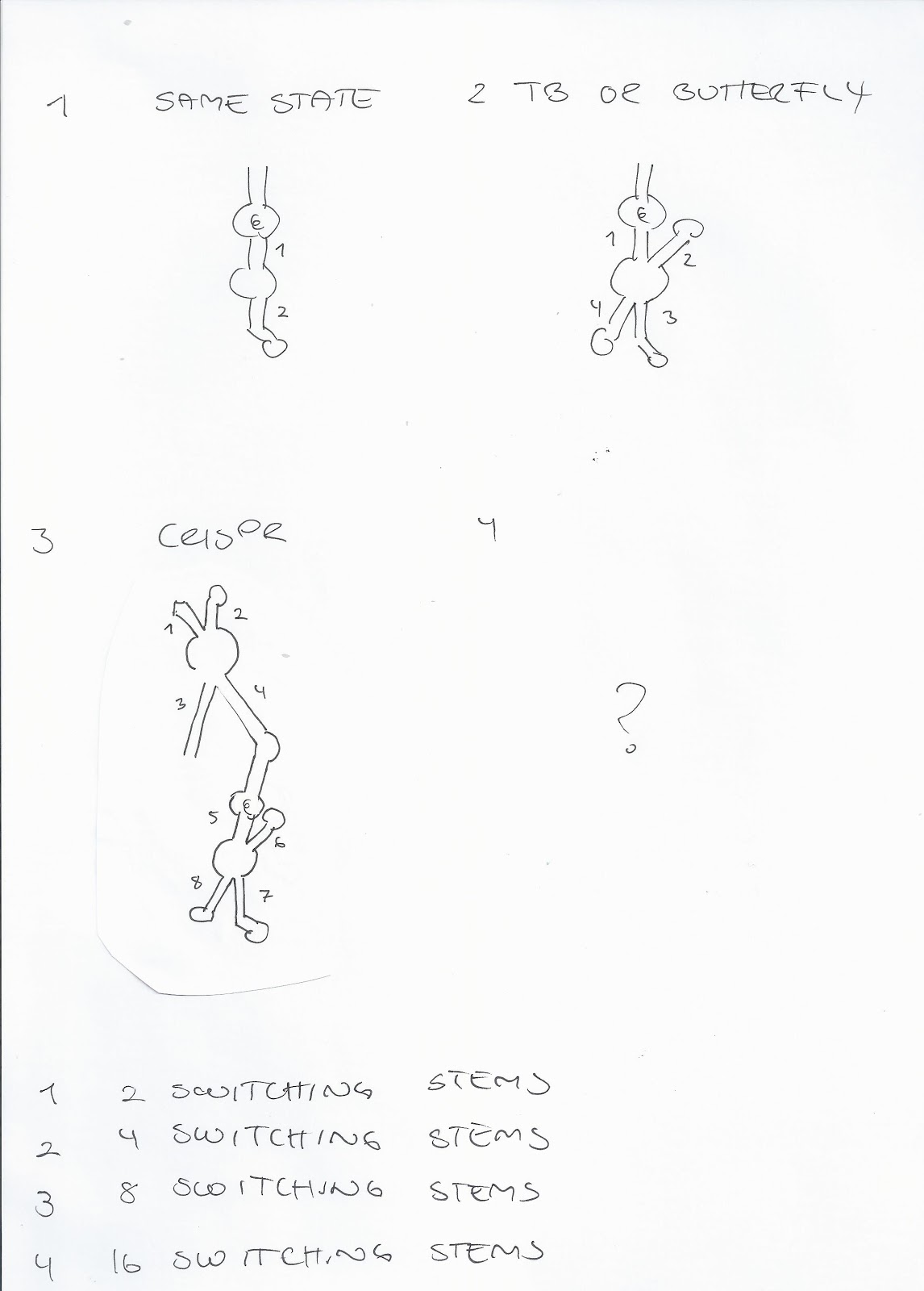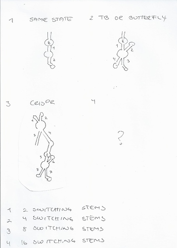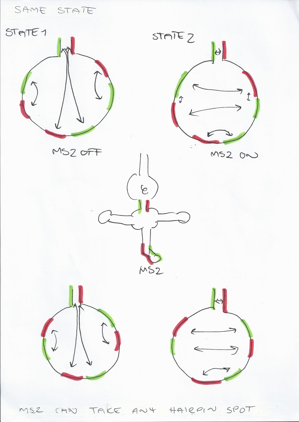 Since there wasn’t space for me to double the blueprint of the above design, I did the second best. I added an extra switching hairpin. I started to play around with one MS2 hairpin and 2 switching hairpin stems + a neck of identical sequence as the bottom of the MS2. In other words, two times two switching hairpins. Those will have a lot of combo options. They can match up all 4. One could also make two different sets of switching stems. (Illustration of the later below)