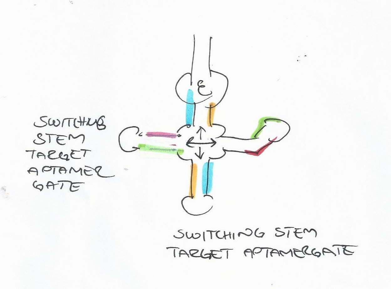 Omei’s talk about coaxial stacking in ON state, made me realize that I will probably not gotten enough bang for my buck in those of my experiments where I placed two coaxial stacks next either MS2 or the aptamer gate. Because adjacent stems only coaxial stack two and two. 3 stems make no double coaxial stacking pair.