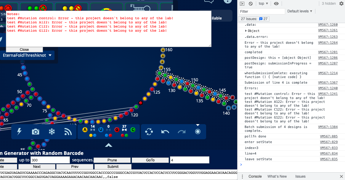 @DigitalEmbrace @MasterStormer with all I am juggling right now, I don’t have the time to work on the Mutation/Submission or Bulk Submission boosters. Both are in need of some major work. That said, most of the functionalitiy of both is available in ArcKnot since it has been able to do mutations for quite some time and I’ve recently added submission. For mutation you can do marking in the lab tool and ‘Import’ the marks, or you can mark bases and pairs with ctrl-click or cmd-click. If you don’t mark anything it will (a) do a “full round” of single base and/or pair muations by default or (b) mutate to try and resolve teh worst conflicts if you are displaying MF!+CNF1 or STK1+CNF1 in the upper half. If you do mark some bases/pairs you can use Mutate, MutateN, or MutateP. Mutate mutates marked bases and pairs independently. MutateN mutates up to 6 bases in combination. MutateP mutates in combination with pairs as AU/CG/GC/GU/UA/UG only. After mutating you can optionally use Prune to throw away what it considers to be bad designs either before or after using Back/Next/Like/Unilike to review the designs.