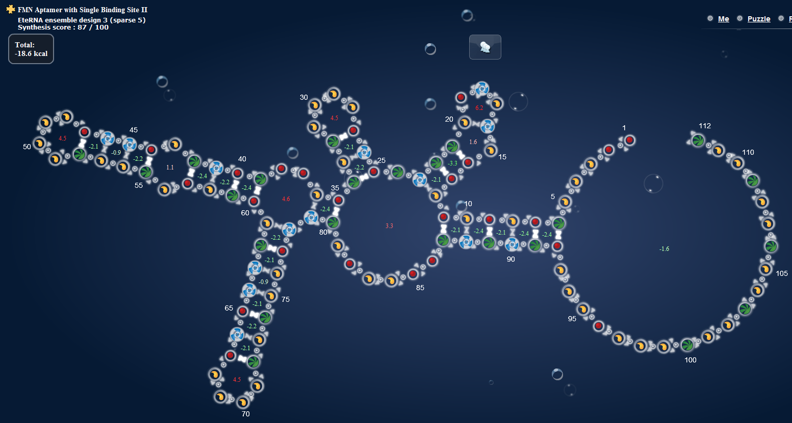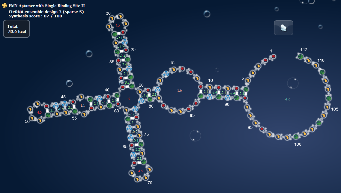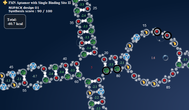 Give –1 pr. each green twin nucleotides present in the design, also if the green twins are placed as a continuation between two elements ( like in an adjacent multiloop). The more green twins there are, the higher posibility that one of them pair up with the red twins in the aptamer.