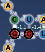 Notice the two red nucleotides beside each other. I think two red nucleotides in line, when in connection with a multi loop weakens the puzzle. Brourd said the C wants to pair up else where. I think this will be the case when this pattern shows up in connections to hairpin loops and internal loops too.