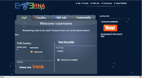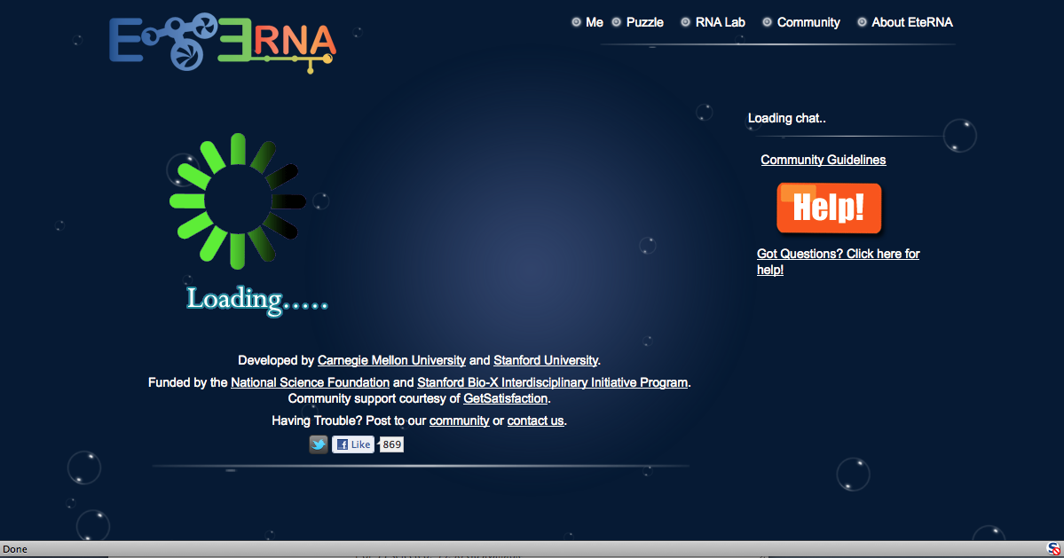 EteRNA is having trouble loading for me right now. I’m on a Mac using Firefox. I also tried Safari and was able to load at first (and see the chat and everything) but as soon as I tried logging in to report the issue in chat I started getting the same results I had in Firefox.