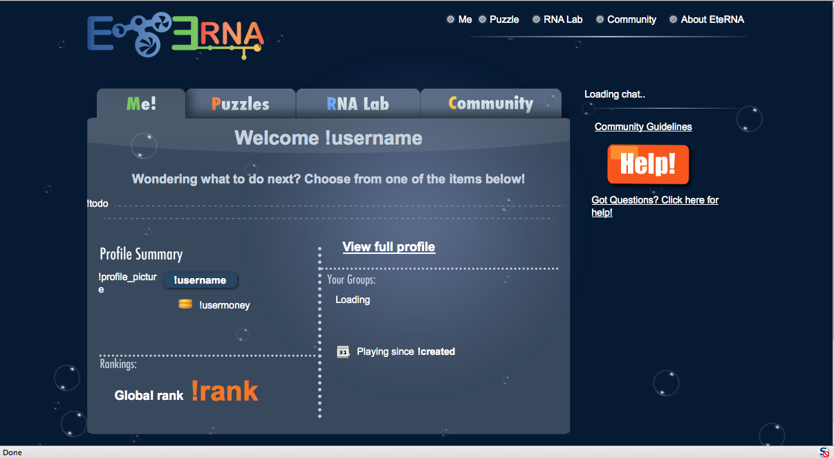 I tried clearing my browser history (cache, cookies, the whole deal) and reloading EteRNA. I get the login screen, and I can see the chat on that. But as soon as I enter my username/password, the issues come back.